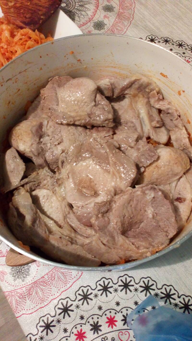 1/2 kupusa izvadimo iz šerpe. Preostali kupus rasporedimo po dnu šerpe. Preko kupusa poređamo meso. Prekrijemo prethodno odvojenim kupusom.