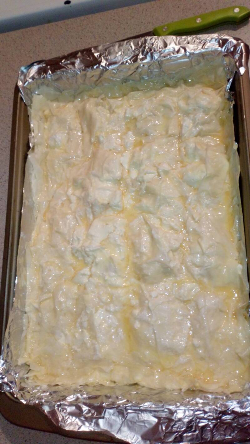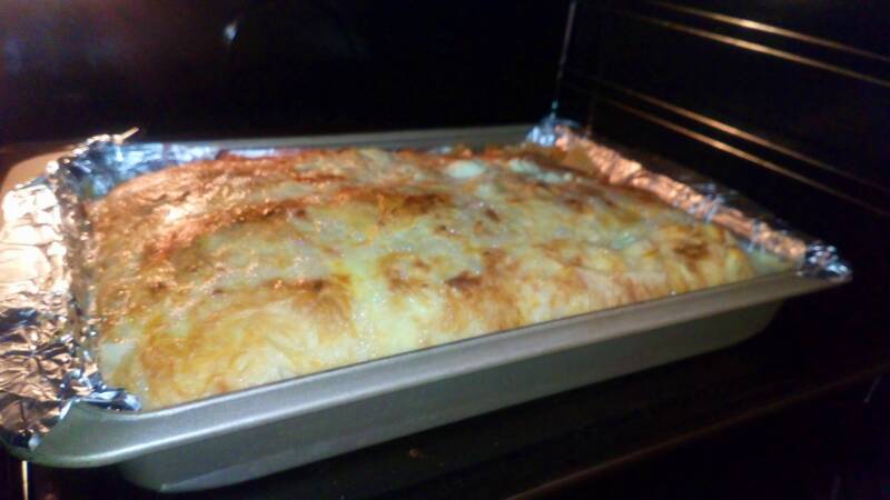 Posle dvadesetak minuta pečenja, prekrijemo pleh komadom aluminijumske folije, jer pita treba da porumeni ali ne i da izgori.