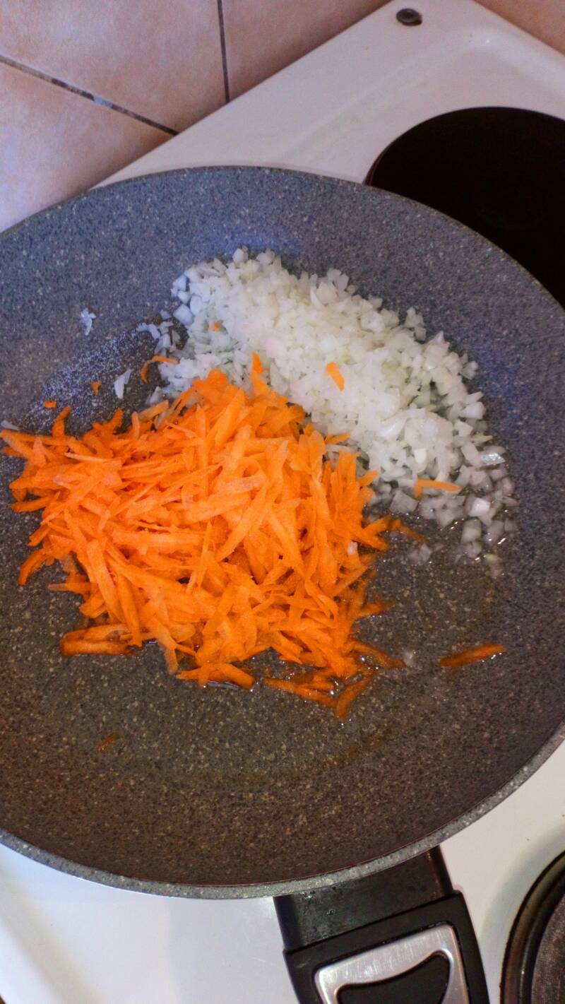 Najpre pržimo luk i šargarepu, 10 minuta, uz dodavanje vode ako je potrebno da povrće ne bi zagorelo.