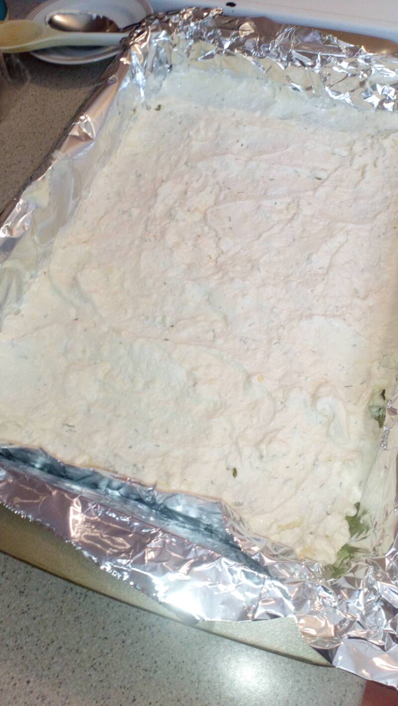 U dubljoj posudi viljuškom izgnječimo feta sir. Dodamo Horeca krem, dva jaja i rendani kačkavalj. Sve dobro promešamo.