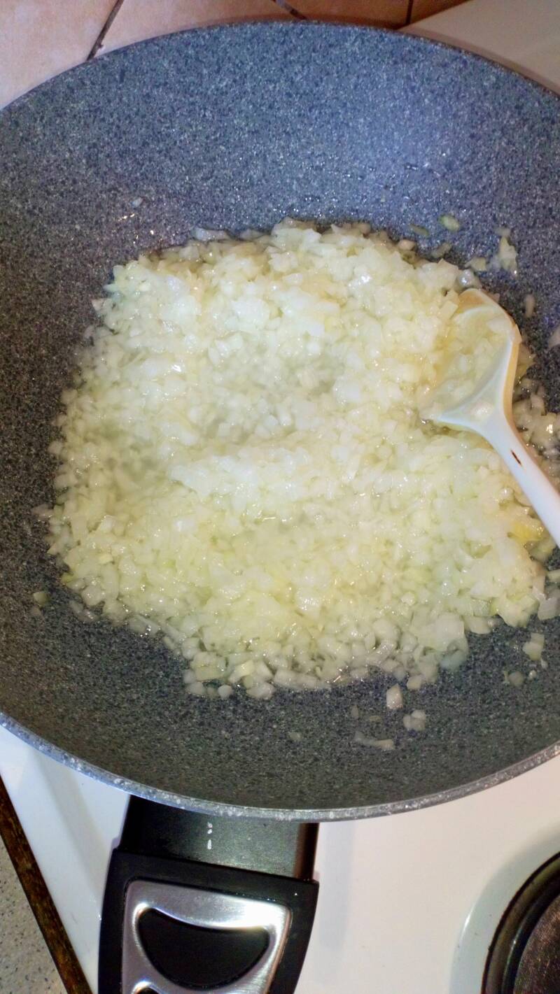 Crni luk iseckamo na sitne kockice i prodinstamo u dubljem tiganju 15 minuta.