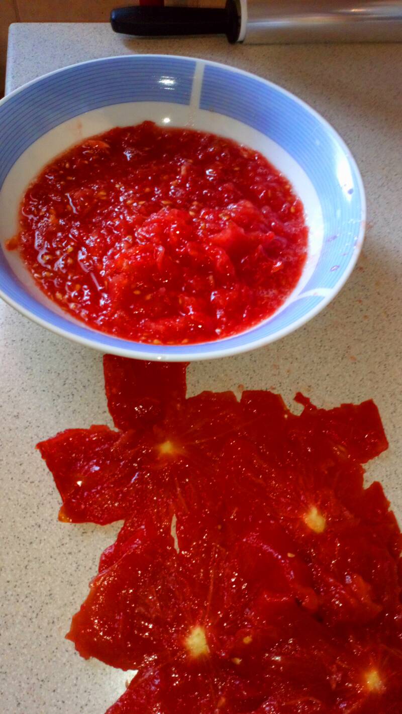 Na krupnije rende „za jabuke“ izrendamo paradajiz. Počinjemo da rendamo od zasečenog dela. U izrendan paradajz dodamo 2 kafene kašičice začina C i promešamo.