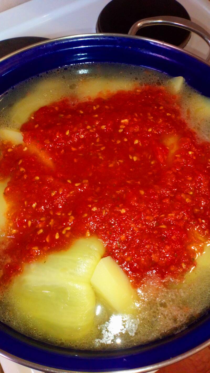 Ako punjenu papriku spremamo zimi (jer smo ostavili nekoliko paketa sveže paprike u zamrzivaču), umesto rendanog paradajza koristimo 250 ml soka od paradajza. Obratite pažnju da nam je potreban čist stok od paradajza, bez dodataka bosiljka, belog luka ili nečeg drugog.
