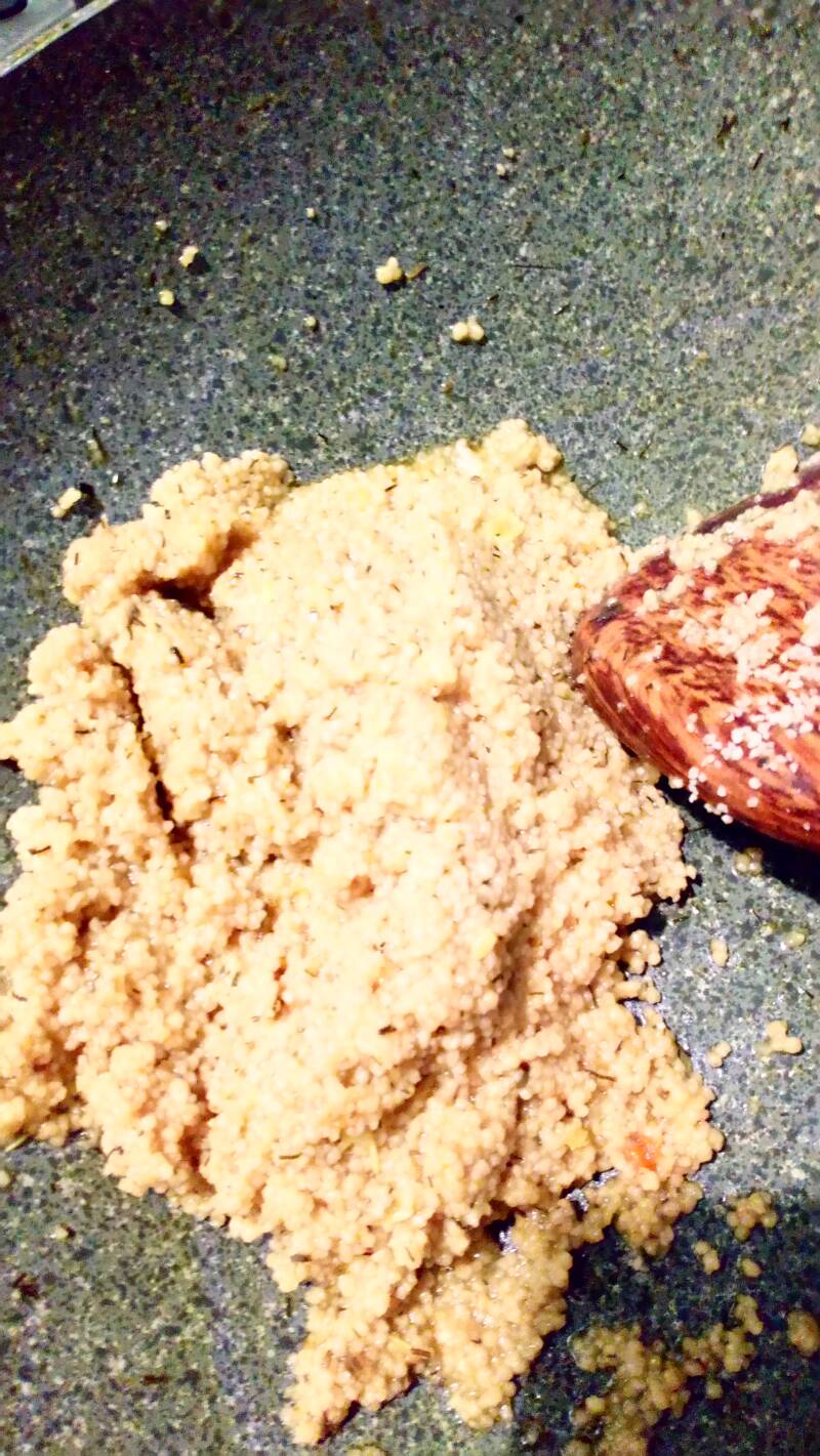 Direktno u ovu tečnost, dodamo 2-3 supene kašike kuskusa (u zavisnosti od toga koliko je tečnosti preostalo).
