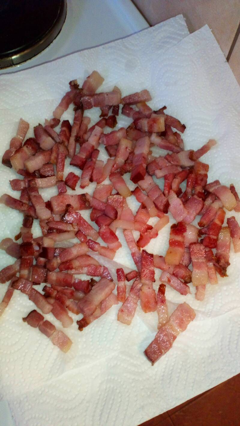 Slaninu iseckamo na tanke prutiće. Stavimo je u tiganj i pržimo 5-10 minuta. Ne želimo da zagori jer onda postane gorka.