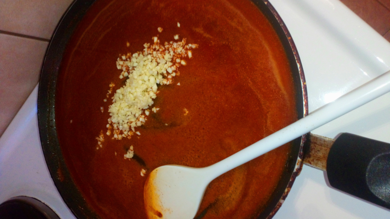 Kada brašno počne da vri i da menja boju (polako postaje žućkasto) sklonimo tiganj sa vatre i dodamo mlevenu slatku alevu papriku i iseckan beli luk. Dobro promešamo i vratimo tiganj na ringlu.