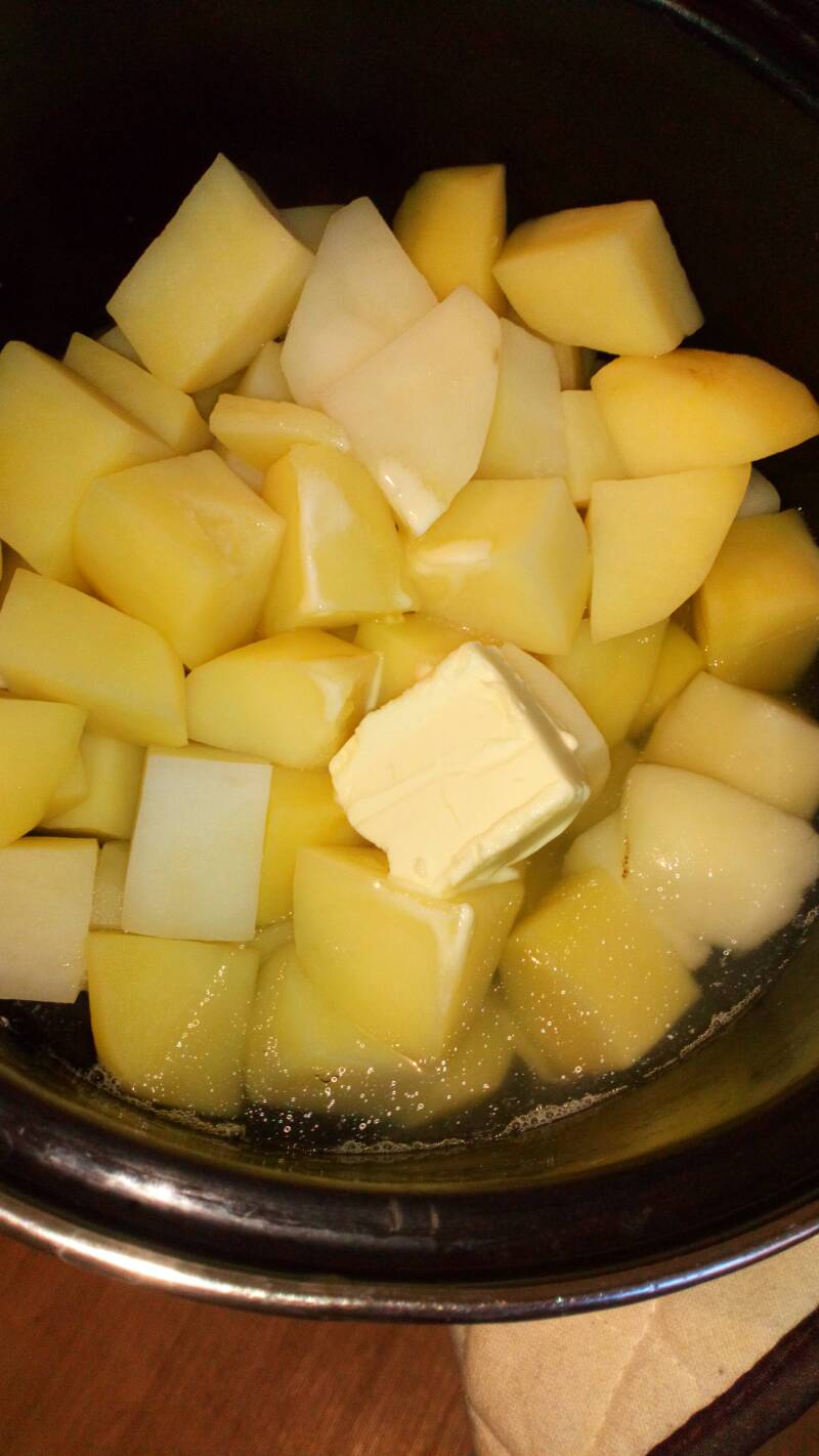 Odlijemo vodu u kojoj se kuvao krompir, ali ne sasvim, već ostavimo malo vode na dnu, tek toliko tečnosti da prekrije dno šerpe.