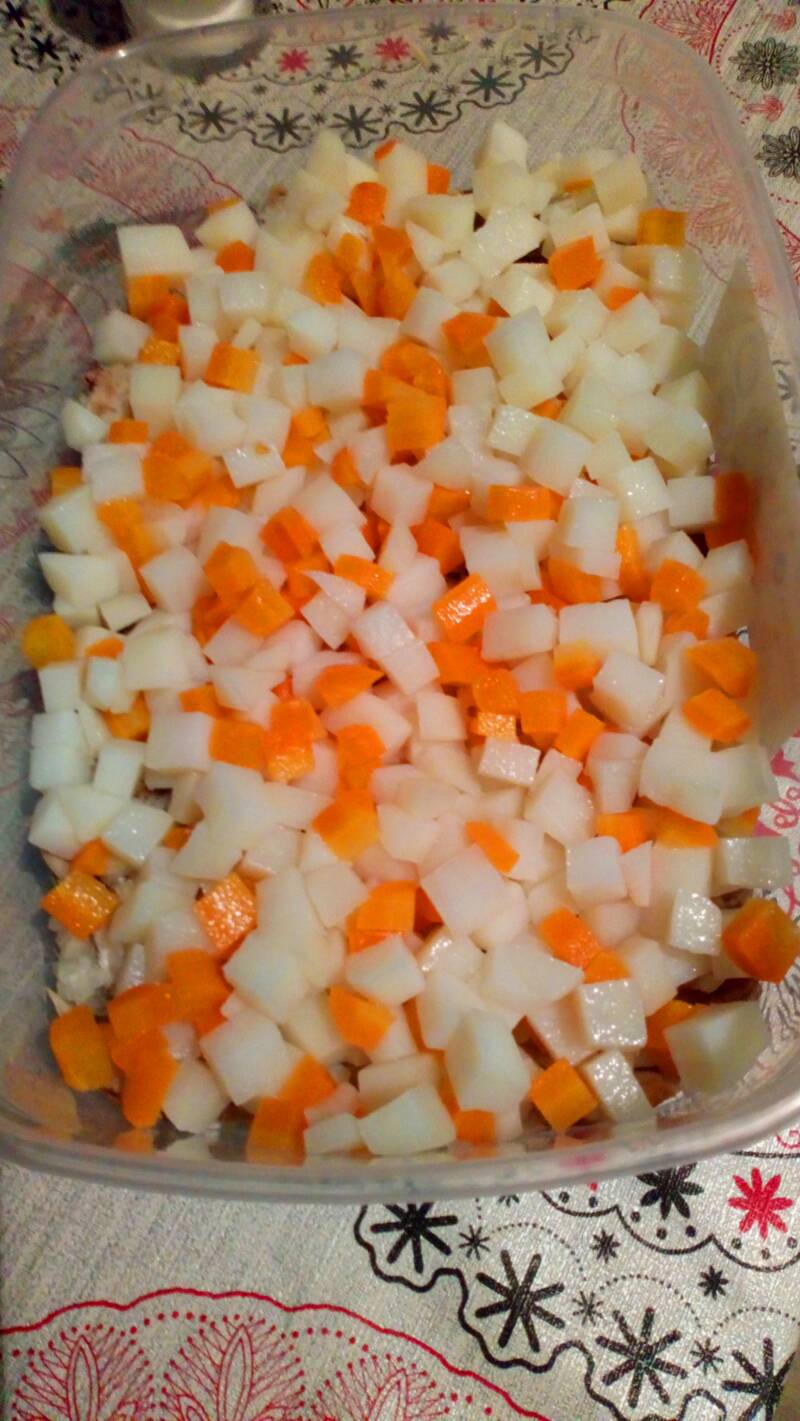 Krompir i šargarepu iseckamo na kockice i obarimo (lagano vri 15 minuta).