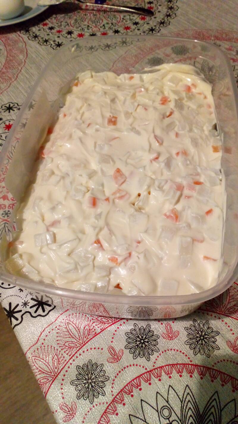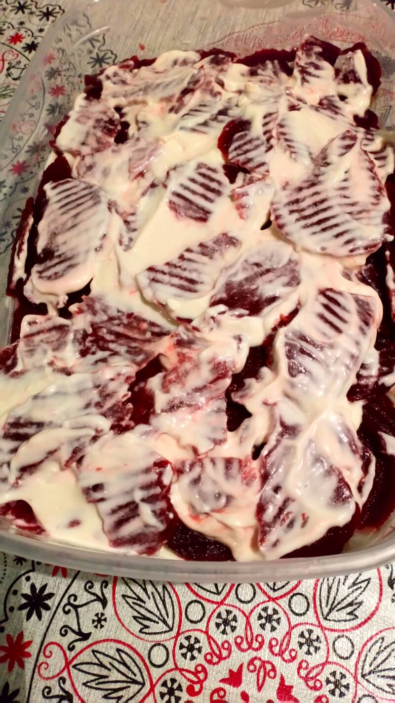 Preko majoneza poređamo listiće obarene cvekle. Malo posolimo i prelijemo sirćetom.